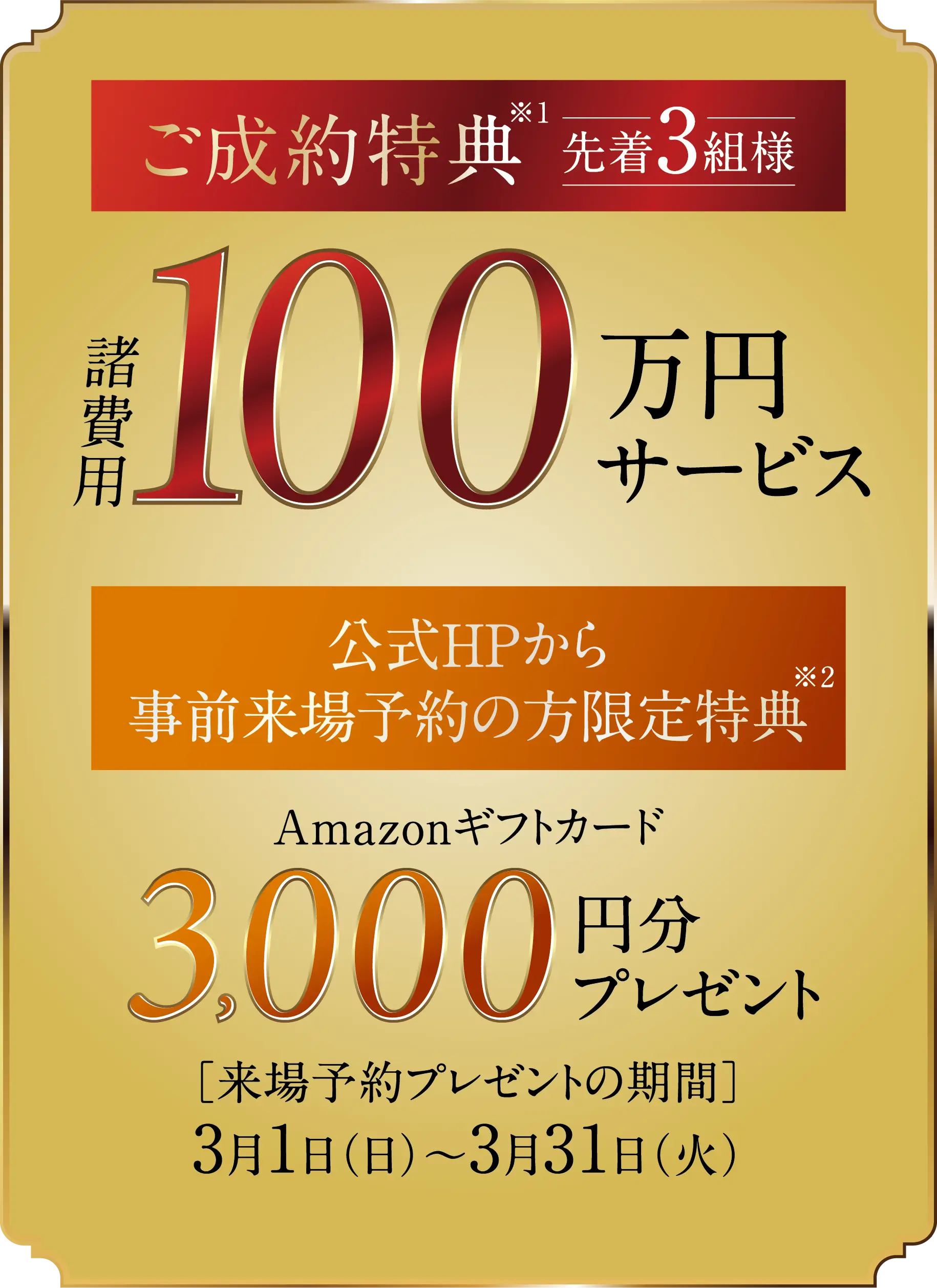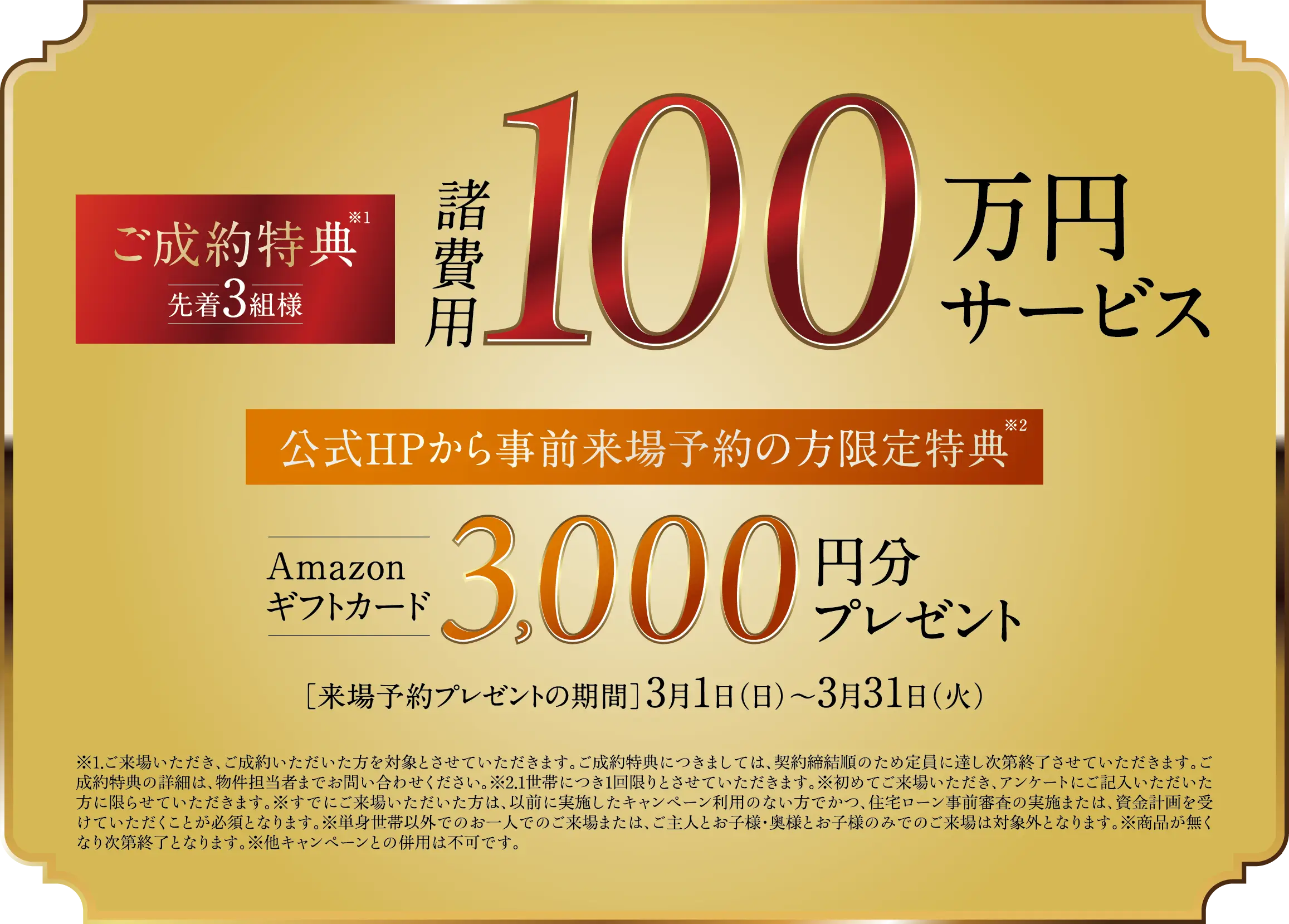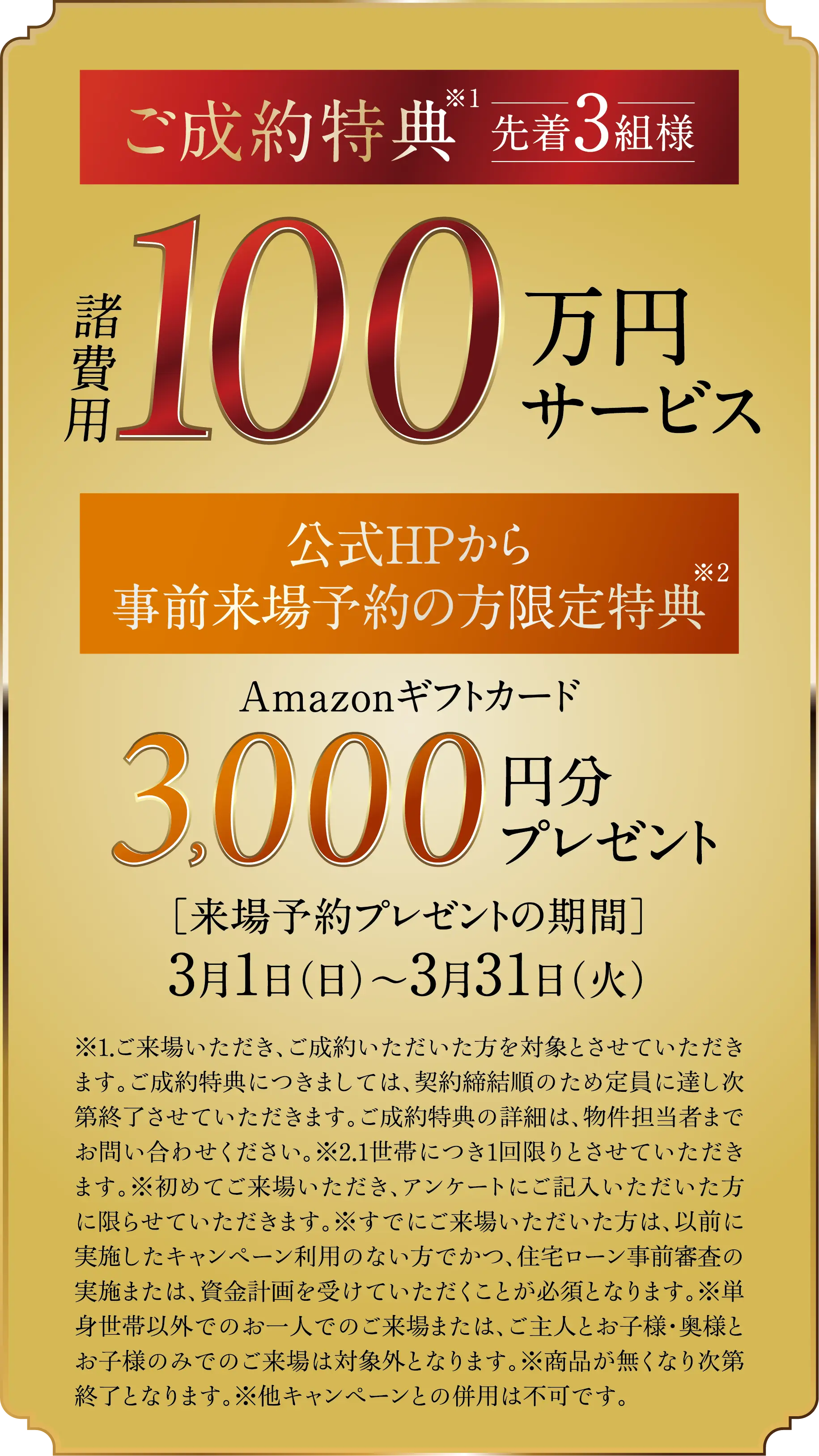 ※1.ご来場いただき、ご成約いただいた方を対象とさせていただきます。ご成約特典につきましては、契約締結順のため定員に達し次第終了させていただきます。ご成約特典の詳細は、物件担当者までお問い合わせください。※2.1世帯につき1回限りとさせていただきます。※初めてご来場いただき、アンケートにご記入いただいた方に限らせていただきます。※すでにご来場いただいた方は、以前に実施したキャンペーン利用のない方でかつ、住宅ローン事前審査の実施または、資金計画を受けていただくことが必須となります。※単身世帯以外でのお一人でのご来場または、ご主人とお子様・奥様とお子様のみでのご来場は対象外となります。※商品が無くなり次第終了となります。※他キャンペーンとの併用は不可です。