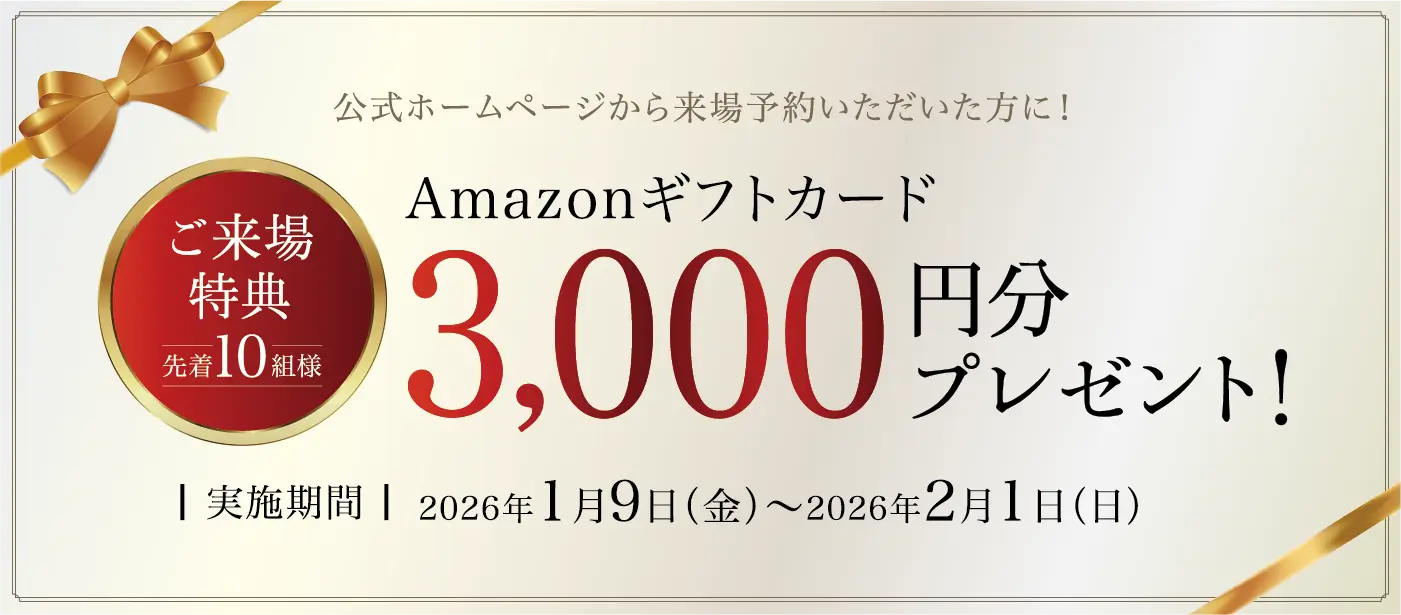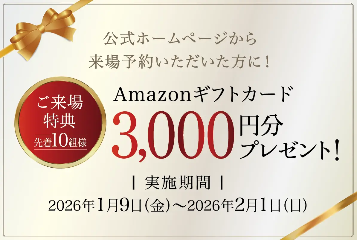 ※先着10組、1世帯につき1回限りとさせていただきます。※実施期間中に初めてご来場いただき、アンケートにご記入いただいた方に限らせていただきます。※すでにご来場いただいた方は、以前に実施したキャンペーン利用のない方でかつ、住宅ローン事前審査の実施または、資金計画を受けていただくことが必須となります。※単身世帯以外でのお一人でのご来場または、ご主人とお子様・奥様とお子様のみでのご来場は対象外となります。※商品が無くなり次第終了となります。※他キャンペーンとの併用は不可です。