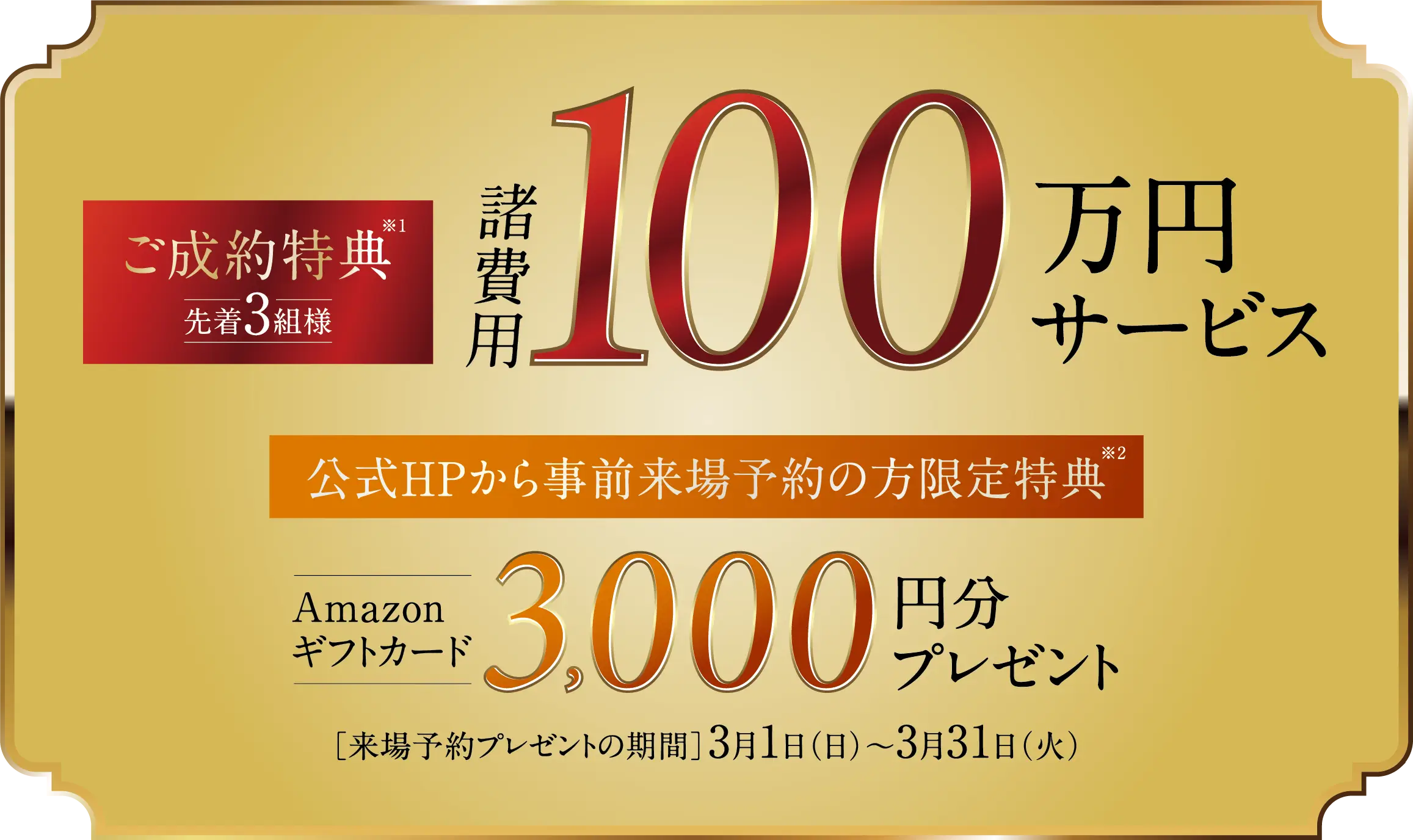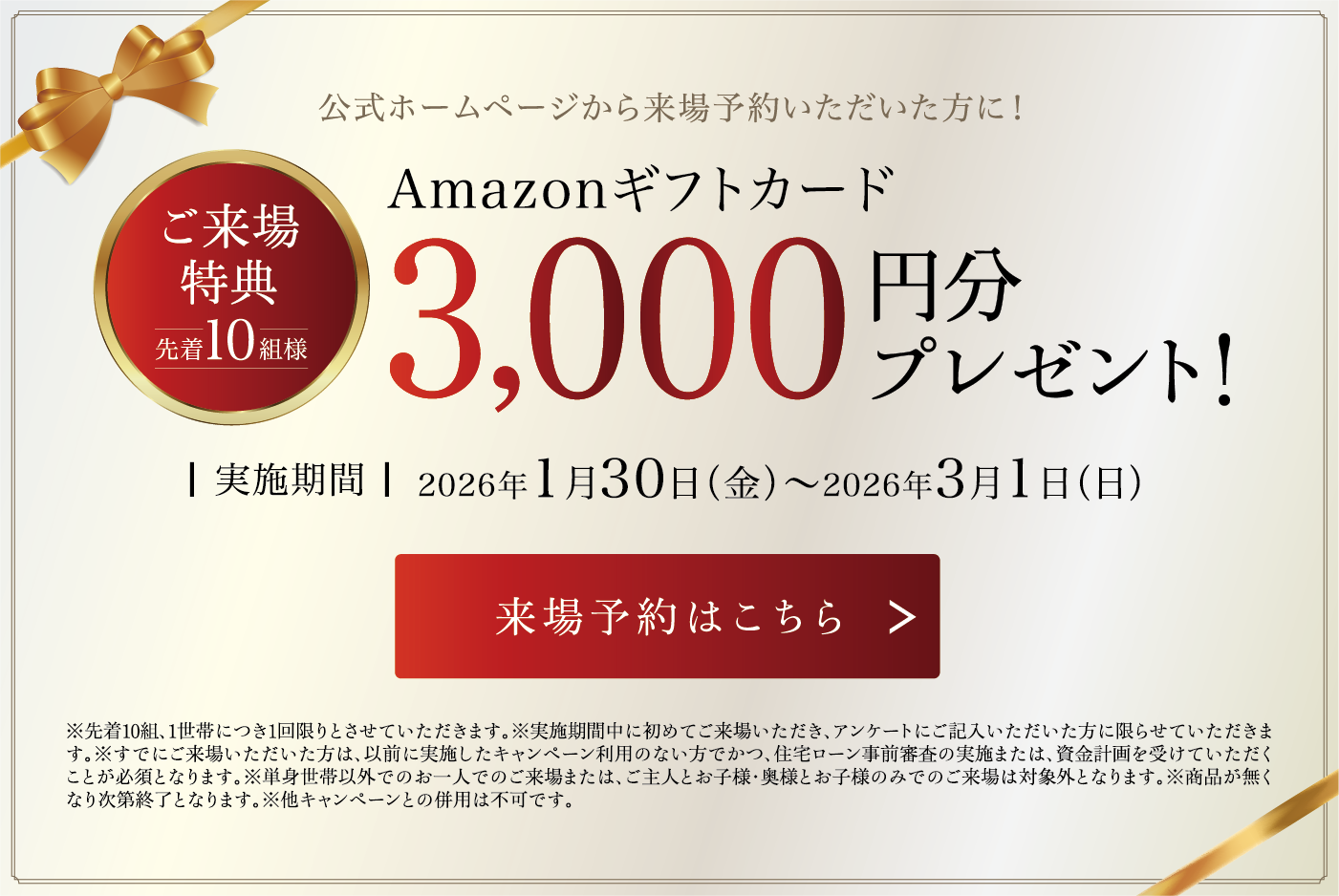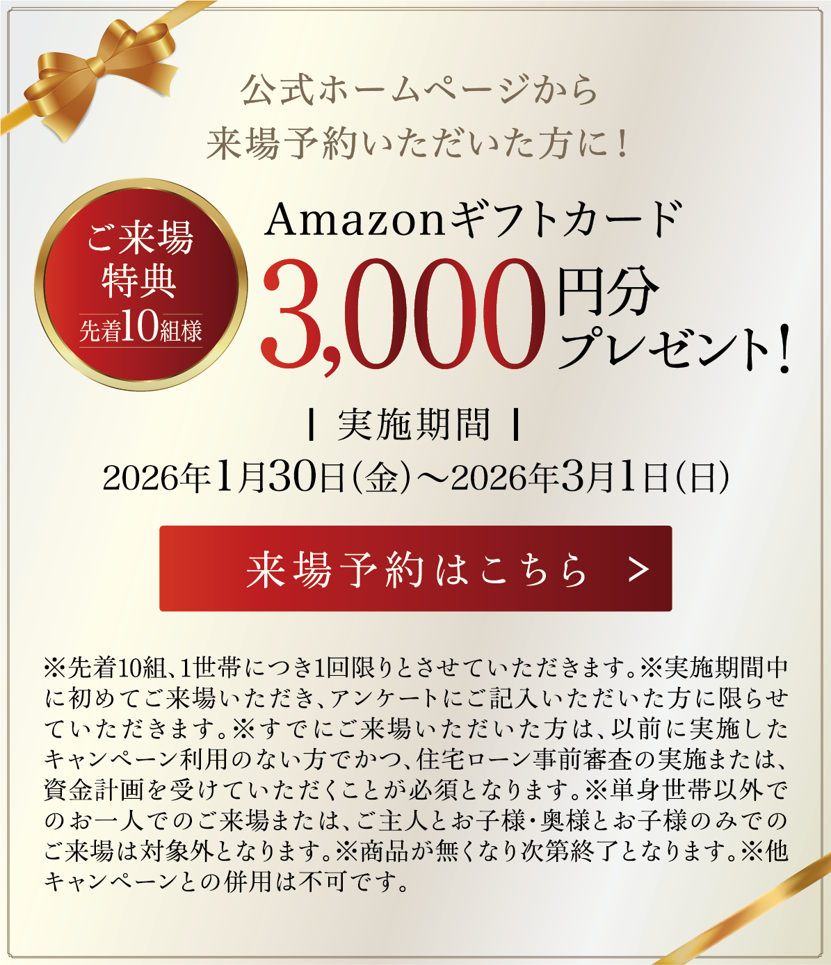 ※先着10組、1世帯につき1回限りとさせていただきます。※実施期間中に初めてご来場いただき、アンケートにご記入いただいた方に限らせていただきます。※すでにご来場いただいた方は、以前に実施したキャンペーン利用のない方でかつ、住宅ローン事前審査の実施または、資金計画を受けていただくことが必須となります。※単身世帯以外でのお一人でのご来場または、ご主人とお子様・奥様とお子様のみでのご来場は対象外となります。※商品が無くなり次第終了となります。※他キャンペーンとの併用は不可です。